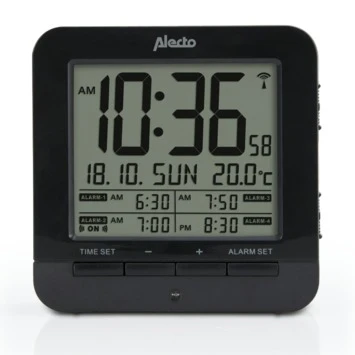 Alecto AK-20 wekker met thermometer en weergave binnentemperatuur is verkrijgbaar in de kleur: zwart. Op het beeldscherm van deze wekker kun je veel informatie aflezen. Te beginnen met de tijd, aangegeven in uren, minuten en seconden; tot op de milliseconde nauwkeurig dankzij de DCF-gestuurde klok. Daaronder staan de datum, dag en temperatuur vermeld. En daaronder de wektijden die je hebt ingesteld.