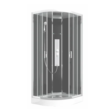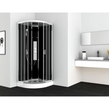 Met de Allibert douchecabine Gipsy 90x90cm kwartrond haal je een zeer complete set in huis; de douchecabine wordt geleverd met een douchekolom, een 3-standen handdouche met doucheslang en een kraan. Ook is deze douche voorzien van Hydromassagestralen en een bedieningspaneel om te switchen van hoofddouche, naar handdouche of de hydrostralen. De douchecel heeft een afmeting van 90 x 90 cm. De cel is voorzien van een schuifdeur.