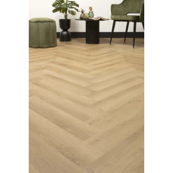 Bruynzeel Visgraat Luxemburg is een hoogwaardige PVC vloer met de uitstraling van een écht houten visgraatvloer, maar dan met alle voordelen die een PVC vloer van nature biedt. De vloeren zijn voorzien van een klikverbinding waardoor ze eenvoudig zelf te plaatsen zijn. De Bruynzeel Visgraat vloer is slechts 4 mm dik, dus ideaal voor renovatie. Deze vloer is 100% waterbestendig, dus ideaal voor gebruik in vochtige ruimtes zoals de badkamer, toilet of keuken. Bovendien is de vloer ideaal voor gebruik in combinatie met vloerverwarming