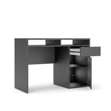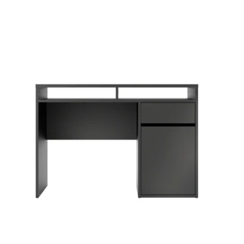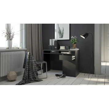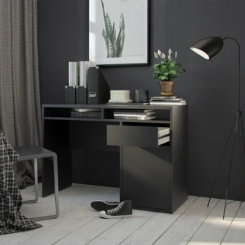 De bureau Eline is gemaakt van hout en het heeft een zwart/donkerbruine kleur. Het bureau is in twee kleuren verkrijgbaar, wit en zwart. Het bureau Eline is een modern en stoere bureau die zowel in een tienerkamer als in een volwassen kantoor past, maar ook in de woonkamer of studeerkamer. Het bureau Eline heeft een groot blad en een lade voor opbergruimte, het is ideaal om aan te studeren of te werken. Het tafelblad is groot genoeg voor bijvoorbeeld: een lamp, computer, schrijfgerief, notitieboekje. De hoogte van de bureau Eline is 78,4cm, de diepte is 48,2cm en de breedte is 1,102cm.