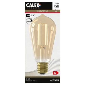 De Calex LED filament is een energiezuinig alternatief voor de spaarlamp en de gloeilamp. Deze lichtbron is goud gekleurd en bevat een E27 fitting. Deze lamp heeft een warm en sfeervol flame lichtkleur. Ook is deze lamp te dimmen met een lichtschakelaar. Met een wattage van 3.5 watt en een lichtopbrengst van 250 lumen, is de Calex filament ideaal voor in de slaapkamer. Ook is deze lamp dimbaar. Door de LED-technologie is deze lamp zowel duurzaam als besparend. Kortom, de Calex filament is een prettige verlichtingsbron voor in de woonruimte.