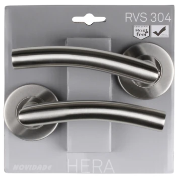 De Hera deurkrukset rond rozet is geschikt voor zowel board als massieve deuren. De deurkrukset is voorzien van een zogenaamde hulpveer waardoor voorkomen wordt dat de kruk gaat hangen. Dankzij de zogenaamde blinde bevestiging komen de schroeven niet in het zicht.