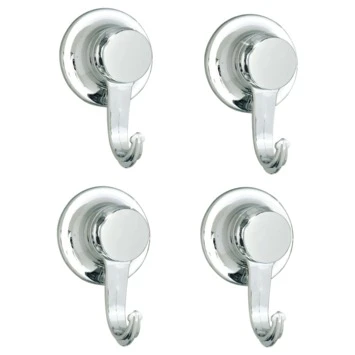 De Everloc hakenset 4 stuks chroom is set van 4 kleine haken die je gemakkelijk afzonderlijk bevestigd zonder de muur te beschadigen. Met het gepatenteerde vacuüm systeem van Everloc is schroeven en boren niet meer nodig. Door de draaiknop trekt de zuignap vacuüm en zit deze meteen muurvast. Ideaal voor in een huurhuis waar je vaak niet in de muren mag boren. Het Everloc systeem laat geen sporen na en blijft toch perfect hangen. Door de chroom afwerking is dit hoekrek tijdloos en past het bij andere badkameraccessoires.