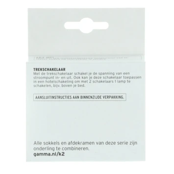 Met de GAMMA K2 Trekschakelaar Crème kun je heel handig een lichtpunt met een trekkoord bedienen. Het trekkoord wordt niet meegeleverd, maar je vindt dit in het schap met elektrische installatiematerialen.