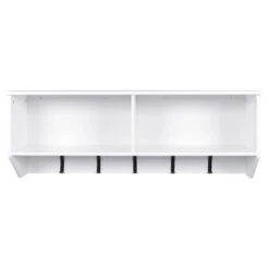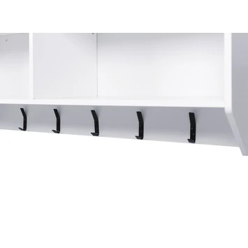 Kapstok Anne is een mooie witte kapstok met 5 zwarte haken. Deze kapstok heeft extra opbergruimte boven de haken. De kapstok is gemaakt van MDF in de kleur wit.