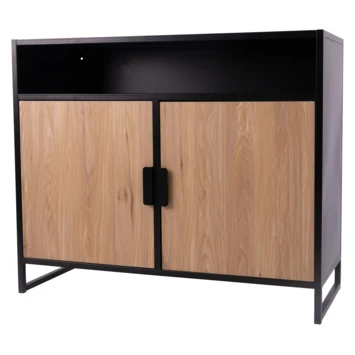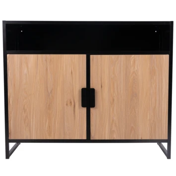 Kast Danny is een mooie praktische kast met 2 deuren en een open opbergvak. De kast is uitgevoerd in een eikenhouten kleur gecombineerd met zwart metaal.