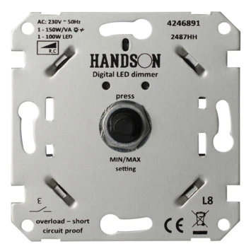 De GAMMA LED dimmer (230VAC/50Hz, 1-150W/VA) met hotelschakeling is een fase-afsnij dimmer (‘R,C’). Dit betekent dat deze dimmer geschikt is om naast dimbare Led, halogeen- en gloeilampen ook elektronische transformatoren en Led drivers te dimmen (mits deze dimbaar zijn en voorzien van de juiste specificaties t.b.v. de toepassing). Door het kunnen instellen van de minimale en maximale stand van de lamp is de dimmer af te stemmen op elke geschikte dimbare led lamp.