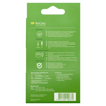De GP oplader ReCyko incl. 4 AA batterijen is aan de achterzijde voorzien van een stekker die je eenvoudig in het stopcontact prikt. De lader is zowel geschikt voor AA-batterijen als voor AAA-batterijen. De lader heeft twee kanalen en twee LED-indicatoren. Het laden gebeurt per paar batterijen, dus je laadt twee of vier AA-batterijen tegelijkertijd, of twee of vier AAA-batterijen. De lader is compact, zodat je hem gemakkelijk meeneemt in rugzak of handtas. Je kunt direct aan de slag, want de meegeleverde AA-batterijen zijn al voorgeladen. ReCyko+ batterijen van GP zijn minimaal 300 keer opnieuw te gebruiken.