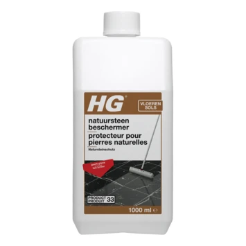 HG natuursteen beschermfilm met glans (HG product 33) is een zeer eenvoudig aan te brengen, vloeibare, polymeer emulsie die na droging een flinterdunne maar uiterst sterke, glanzende beschermfilm vormt. Hierdoor wordt de toplaag van het natuursteen beschermd tegen slijtage en beschadiging of aantasting door zuren zoals frisdranken en wijn. Deze beschermfilm geeft daarnaast ook een anti-slip effect.