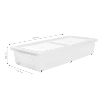 IRIS Modular Clear Box Under Bed is een ideale transparante box om spullen onder je bed te bewaren, zodat er geen stof of vuil bij komt. De boxen komen in een set van 2 en hebben een inhoud van 35 liter. Door de wieltjes is de nestbare box van 800 mm lang, 400 mm breed en 160 mm hoog ook makkelijk onder je bed te rollen. Goed om te weten: de IRIS Modular Clear Box Under Bed wordt geleverd inclusief deksels.