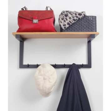 Een combinatie van landelijk en industrieel, dat komt terug in deze kapstok. Deze wandkapstok heeft massief eikenhouten (hoeden)plank met daaronder een zwart afgewerkt metalen frame.