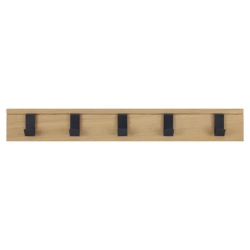 Deze massief eikenhouten kapstok bevat 5 zwarte haken van metaal. De haken zijn verschuifbaar.