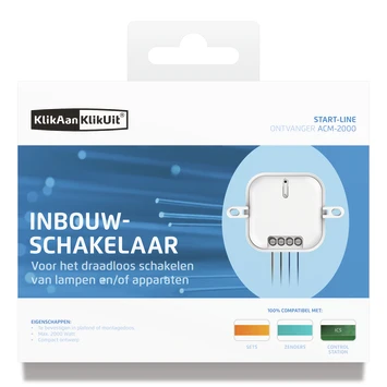 Deze KlikAanKlikUit Inbouwschakelaar ACM-2000 kun je netjes verwerken in een bestaande wand- of plafonddoos. Vervolgens kun je met verschillende zenders, de verlichting of apparatuur in- en uitschakelen.