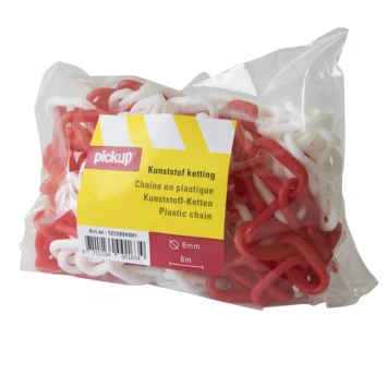 Kunststof ketting in opvallend rood en wit om snel en duidelijk een gebied voor langere tijd af te bakenen. Weerbestendig.