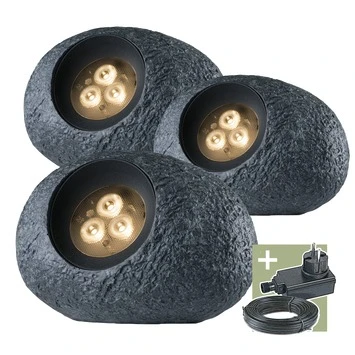 Een onopvallende lamp is deze Ludeco tuinspot Ingor wanneer je hem tussen de stenen plaatst. Bij deze lamp is de LED geplaatst in een kunststof steen. Met hun 1,5 watt aan vermogen zijn het zeer zuinige spots die een lichtopbrengst hebben van 150 lumen per stuk. Met deze startersset en plug & play systeem is deze lamp snel geïnstalleerd op elke plek in jouw tuin. Het beschermingsniveau van deze Ingor is IP44 en daarmee spatwaterdicht. Deze set van 3 is ook los te verkrijgen en aan te sluiten of dezelfde kabel. Bekijk hiervoor het assortiment Ludeco lampen op onze website.