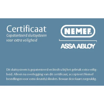 Door de SKG***®, waarmee de Nemef veiligheidscilinder 132/9p is voorzien, is deze zeer geschikt voor toepassing binnen het Politiekeurmerk Veilig Wonen. Een extra zekerheid; door het technisch patent zijn de sleutels niet na te maken. Doormiddel van de bijgeleverde kaart is het wel eenvoudig originele sleutels en cilinders na te bestellen. Met deze hoogwaardige Nemef cilinder geef je inbrekers minder kans om je deur open te breken, mede dankzij kerntrekbeveiliging en de uitgebreide bescherming van de cilinder tegen uitboren. De gevarenfunctie van deze Nemef cilinder zorgt ervoor dat je deur ook te openen is wanneer er aan de andere zijde al een sleutel zit. De Nemef 132/9P veiligheidscilinder is verkrijgbaar in gelijksluitende sets (per 2, 3 en 4 stuks), zodat je slecht 1 sleutel nodig hebt om al je deuren te openen. Deze set wordt geleverd met 8 sleutels.