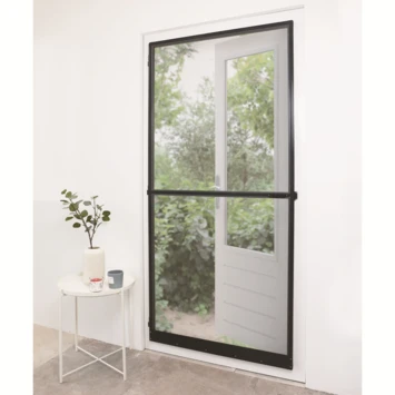 De OK vaste hordeur is een complete set waarmee je een vaste hor kunt creëren die je scharnierend op je kozijn kunt plaatsen. Geschikt voor zowel naar binnen als naar buiten draaiende deuren. De hoogte en breedte zijn eenvoudig aan te passen aan de afmetingen van je kozijn. De hordeur is uitgevoerd met antraciet aluminium profielen en een schopplaat.