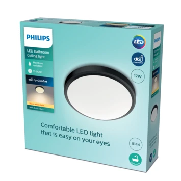 De zwarte Philips Doris is een grote plafondlamp, met geïntegreerd LED-licht. De heldere, warmwitte LED-lichtbron zorgt voor gelijkmatig, natuurlijk licht en schijnt direct op volle kracht, zonder vertraging. Door de IP44-classificatie is deze moderne badkamerlamp zeer geschikt voor vochtige ruimtes. Kan zowel aan het plafond als wand gehangen worden.