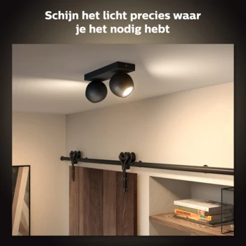 De Philips Hue Buckram 2-lichts opbouwspot bestaat uit een zwarte rechthoekige basisplaat met twee zwarte bolvormige spots die voorzien zijn van White ambiance LED-lampen. De spots worden geleverd compleet met een Hue dimmer switch, maar zijn ook te bedienen met de Hue app op smartphone of tablet. Blader eenvoudig door vier verschillende lichtscènes en dim of versterk het licht naar eigen voorkeur, of je nou lekker wil ontspannen of geconcentreerd zit te lezen. Wil je meer slimme functies? Via een apart verkrijgbare Philips Hue Bridge kun je toegang krijgen tot allerlei functies, zoals timers en routines. Speel met de instellingen in de app op je smartphone of tablet, of bedien je lampen als je niet thuis bent.