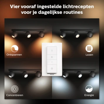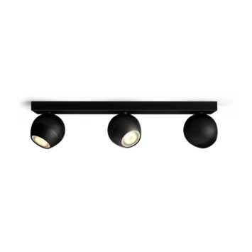 De zwarte Philips Hue Buckram 3-lichts opbouwspot bestaat uit een rechthoekige basisplaat met drie verstelbare, bolvormige spots naast elkaar. Deze zijn allemaal voorzien van een White ambiance LED-lamp die keuze biedt uit warm tot koelwit licht. Daarmee ben je dus voorbereid op elke situatie, van lekker ontspannen tot geconcentreerd lezen. Je kunt de spots gemakkelijk in- en uitschakelen en dimmen via de meegeleverde Philips Hue dimmer switch of via de handige Hue app. Wil je nog meer slimme mogelijkheden? Verbind dan de lamp met de los verkrijgbare Philips Hue Bridge die toegang biedt tot alle Hue functies, zoals timers en routines.