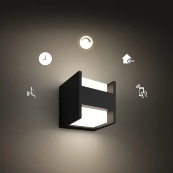 De Fuzo buitenlamp van het merk Philips Hue, is een stijlvolle wandlamp geschikt voor buitengebruik. De lamp bevat geïntegreerde LED verlichting als lichtbron. Led is een energiezuinig alternatief voor halogeenlampen, spaarlampen en gloeilampen. Met led bespaar op je verlichtingskosten, doordat je minder energie verbruikt. De lichtbron heeft een grote lichtopbrengst van 1150 lumen en een maximale wattage van 15 Watt. Deze prachtige buitenlamp heeft een beschermingswaarde van IP44 en is hiermee spatwaterdicht. De energieklasse waar de lamp onder valt is A. Dit is één van de meest zuinige energieklasses. De lichtkleur kun je instellen met de smarthome applicatie. De breedstraler heeft een zwarte kleur en is gemaakt van metaal en kunststof. De afmetingen zijn 13 centimeter hoog, 12,7 centimeter lang en 13 centimeter breed.