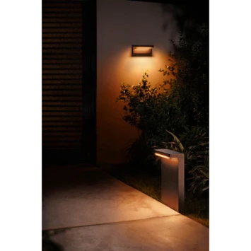 Onbegrensde mogelijkheden. Voor buitengewone ervaringen. De Philips Hue Nyro white and color ambiance sokkellamp verlicht je tuinpad of oprit in alle kleuren van de regenboog. De LED-lamp geeft namelijk 16 miljoen kleuren en 50.000 wittinten. De zwarte sokkellamp werpt zijn licht rechtstreeks op de grond en dat geeft een subtiel en mooi lichteffect. Als je de slimme lamp koppelt aan je Philips Hue bridge kun je elke gewenste kleur van je tuinpad voorprogrammeren. Je kunt de lampen dan bedienen met de Hue app via smartphone of tablet, ook als je niet thuis bent. En verder kun je gebruik maken van slimme verlichtingsmogelijkheden zoals timers en geofencing, waardoor je lampen automatisch gaan branden als je in de buurt komt. De Hue Nyro heeft bovendien een IP44 waterdicht beschermingsniveau.. Onbegrensde mogelijkheden. Schilder je buitenruimte. Met Philips Hue buitenverlichting bestaan er geen grenzen aan de magie die je kunt toevoegen. Speel met 16 miljoen kleuren en alle tinten wit licht om het gewenste effect te creëren. Accentueer objecten, bomen of paden om je ruimte te laten opvallen. Gebruik de Hue App om je favoriete lichtinstellingen op te slaan en naar believen weer op te roepen met een druk op de knop.. Goed thuiskomen met licht. Stel je Philips Hue app zo in dat je verlichting weet wanneer je bijna thuis bent. Nog voordat je uit de auto stapt of het tuinpad op loopt, gaan de door jou geselecteerde slimme lampen automatisch aan.. Eenvoudige bediening en comfort. Bedien het op jouw manier. Verbind je Philips Hue lampen met de bridge en ontdek de eindeloze mogelijkheden. Bedien de lampen vanaf je smartphone of tablet via de Philips Hue app of voeg binnenschakelaars toe aan het systeem om de verlichting aan te passen. Voor een complete beleving van Philips Hue kun je timers, waarschuwingen, alarmen en nog veel meer instellen. Philips Hue werkt ook met Amazon Alexa, Apple HomeKit en Google Assistent, zodat je de lampen met je stem kunt bedienen.. Volledige bediening via smartphone of tablet met de Hue bridge. Philips Hue bridge vereist. Verbind je Philips Hue lampen met de Hue bridge en bedien ze via de Philips Hue app op je smartphone of tablet. Je kunt je Philips Hue lampen ook in- en uitschakelen of dimmen met de Philips Hue dimmer switch.. Speciaal ontworpen voor buiten. Weerbestendig (IP44). Dit Philips Hue buitenarmatuur is speciaal ontworpen voor gebruik in buitenomgevingen en is uitvoerig getest. Het IP-niveau wordt aangegeven met twee cijfers: het eerste cijfer geeft het beschermingsniveau tegen stof aan en het tweede cijfer geeft de vochtbestendigheid aan. Deze lamp is met IP44 ontworpen: hij is spatwaterdicht vanuit alle richtingen. Hierdoor is hij ideaal voor algemeen gebruik buitenshuis. Deze lamp kan gemonteerd worden met een grondpen (artikelnummer 133662).