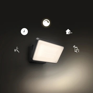 De Philips Hue buitenlamp uit de serie Welcome, is een stijlvolle wandlamp geschikt voor buitengebruik. De lamp bevat geïntegreerde LED verlichting als lichtbron. Led is een energiezuinig alternatief voor halogeenlampen, spaarlampen en gloeilampen. Met led bespaar op je verlichtingskosten, doordat je minder energie verbruikt. De lichtbron heeft een grote lichtopbrengst van 2300 lumen en een maximale wattage van 30 Watt. Deze prachtige buitenlamp heeft een beschermingswaarde van IP44 en is hiermee spatwaterdicht. De energieklasse waar de lamp onder valt is A. Dit is één van de meest zuinige energieklasses. De lichtkleur kun je instellen met de smarthome applicatie. De wandlamp heeft een zwarte kleur en is gemaakt van metaal en kunststof. De afmetingen zijn 15,3 centimeter hoog, 16 centimeter lang en 22 centimeter breed.