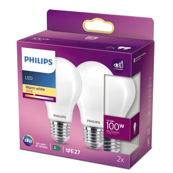 Vervang uw oude lamp met een nieuwe energiezuinige Philips LED-lamp, met warmwit licht. Deze standaardlampen verbruiken circa 80% minder energie dan traditionele lampen dankzij de nieuwste energiezuinige LED-technologie en ze gaan tien keer langer mee. Met EyeComfort, voor licht dat aangenaam is voor uw ogen. Deze lampen hebben een E27-fitting, en passen dus in de meeste lampen met grote fitting.