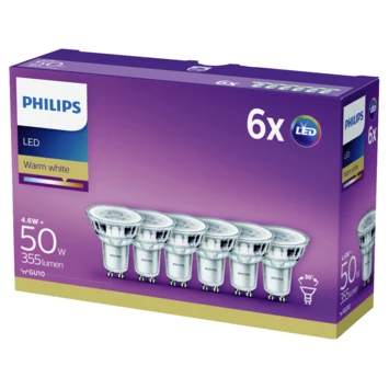 De Philips LED lamp is een energiezuinig alternatief voor de spaarlamp en de gloeilamp. Daarnaast bespaar je ook op je verlichtingskosten. Met de warm witte lichtkleur van deze lamp, is het ideaal om een prettig en ontspannen sfeer te creëren in de woonruimte. Deze lamp heeft een GU10 fitting. De lichtopbrengst van deze verlichtingsbron is 355 lumen met een kleurtemperatuur van 2700 kelvin. De wattage van deze lamp is 4.6 watt. Er zitten 6 spotlampen in een verpakking. Deze duurzame lamp met een lange levensduur, is een prettige verlichtingsbron voor in het woonvertrek.