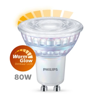 Met deze Philips WarmGlow LED-spot dimt u uw dagelijkse verlichting tot de aangename tonen van gloeilampen, net zo sfeervol als vroeger. Hoe meer u dimt, hoe warmer het licht. Hierin onderscheiden deze LED’s zich van andere dimbare LED-lampen, die alleen minder fel schijnen wanneer ze worden gedimd. WarmGlow lampen tonen de ware kleuren van uw interieur, zoals bij natuurlijke verlichting. Of u nu ’s avonds wilt ontspannen of fris aan de dag wilt beginnen, Philips WarmGlow LED’s bieden het licht dat u nodig hebt. Met EyeComfort, voor licht dat aangenaam is voor uw ogen. Deze lamp heeft een GU10-fitting en gaat vaak perfect samen met uw in- of opbouwspots.