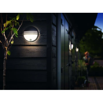 De Philips Buitenlamp Yarrow met bewegingssensor zwart LED 6W is een bescheiden wandlamp voor buiten. De buitenlamp beschikt over een bewegingssensor en schakelt automatisch het licht in wanneer je thuiskomt en waarschuwt je als er iemand aankomt. De bewegingsmelder wordt uitgeschakeld bij daglicht. De ronde zwarte lamp heeft een diameter van 21,3 centimeter en is 8,3 centimeter diep en neemt daarom niet veel ruimte in beslag. De lamp wordt geleverd met een LED-lamp van 6 watt. Kortom, de Philips Yarrow buitenlamp is een multifunctionele verlichtingsbron voor om het huis.