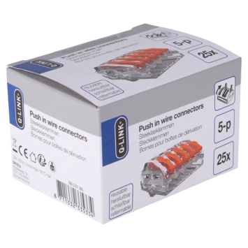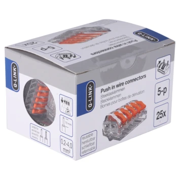 Met deze hoogwaardige 5-polige lasklem maak je eenvoudig en veilig elektrische verbindingen. Of je nu een professional bent of een doe-het-zelver, deze lasklem biedt gemak en betrouwbaarheid. Dankzij het innovatieve ontwerp is de Q-Link Conex lasklem hersluitbaar, waardoor je flexibiliteit hebt bij het aanpassen en veranderen van je elektrische installatie. Geen gedoe meer met losse draden en kabels die uit elkaar vallen. Met een capaciteit van 4 mm is deze lasklem geschikt voor een breed scala aan draaddiktes. De Q-Link Conex lasklem voldoet aan de hoogste kwaliteitsnormen en is gemaakt van duurzame materialen. Hierdoor ben je verzekerd van een veilige en langdurige elektrische verbinding. Bovendien is de lasklem gemakkelijk te installeren en te gebruiken, zelfs voor beginners. Voor gebruik van massief, geslagen en flexibele installatie draad van 0,2 t/m 4,0 mm². Nominaal tot 600V max. voor bekabeling van gebouwen tot 1000V max. verlichtingsarmaturen en tekenen. Test-poort aan de achterkant.