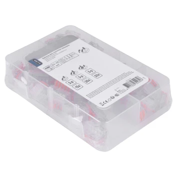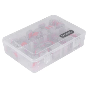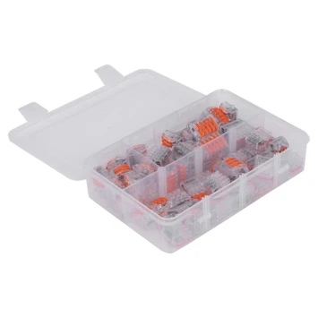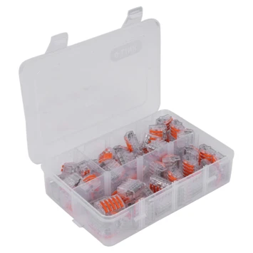Hersluitbare lasklemmen geleverd in een praktische kunststof doos. De hersluitbare lasklemmen worden geleverd in een praktische kunststof doos met 3 vakken en transparante klikdeksel. De 65–delige kit bestaat uit: 15 x 2–polig, 30 x 3–polig, 20 x 5–polig. Maximale doorsnede massief en flexibel 4 mm². Aantal klemposities: 5. Nominale doorsnede van/tot: 0.5–2.5mm². Kleur: Transparant.