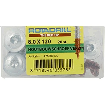 Rotadrill® houtbouwschroeven zijn bedoeld voor het verbinden van houten balken en dragende houtconstructies. Door de brede tellerkop hebben de schroeven een groot draagvlak en klembereik, zodat u stevige verbindingen kunt maken. Deze verzinkte schroeven zijn een ideale vervanger voor de ouderwetse houtdraadbouten: sterker, met een hogere uittrekwaarde en gemakkelijk in te schroeven met een (slag)boormachine, waarbij de torx-aandrijving zorgt voor veel grip en optimale krachtoverbrenging. De rode punt aan de Rotadrill® schroeven is een gepatenteerd smeermiddel dat ervoor zorgt dat de schroeven zeer licht indraaien. De houtbouwschroeven worden geleverd in een stevige kunststof bewaarverpakking. In iedere kuip-verpakking wordt gratis het bijpassende torx-bitje meegeleverd.