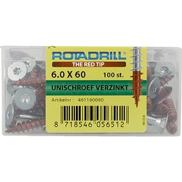 Zoek je een multifunctionele schroef die je binnenshuis in hout of in een plug kunt gebruiken? Ga dan voor de Rotadrill schroef universeel platkop torx verzinkt 6.0×60 mm 100 stuks. Deze universele schroef van Rotadrill wordt ook wel een spaanplaatschroef genoemd en is de meestgebruikte schroef voor hout, maar ook plaatmaterialen zoals spaanplaten of houtvezelplaten. De schroef is afgewerkt met een platkop, wat inhoudt dat hij een tapstoelopend gedeelte onder de kop heeft die mooi in het materiaal wegzakt. De schroef heeft een torxkop van het type T25. Je kunt hem dus met een torx-bitje of schroevendraaier indraaien. Bovendien is de schroef gemaakt van verzinkt staal en dus zeer goed bestand tegen stoten en slijtage, maar minder goed tegen vocht. De rode punt aan de Rotadrill-schroeven is gepatenteerd smeermiddel dat ervoor zorgt dat de schroeven zeer licht indraaien en makkelijk te verwerken zijn in verschillende bouwmaterialen. Dit product wordt verkocht per 100 stuks, dus je hebt altijd een schroef achter de hand. Andere maat nodig? Geen probleem, want GAMMA heeft een breed assortiment van verschillende materialen, schroefmaten en kopvormen. Kortom: optimaal schroefgemak met deze universele schroef van Rotadrill.