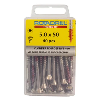 Rotadrill® Vlonderschroeven zijn gemaakt van speciaal gehard rvs 410. Dit type roestvrij staal is twee keer zo sterk als rvs A2 waardoor u niet bang hoeft te zijn dat de schroeven afbreken tijdens het indraaien. De speciale boorpunt aan de hardhoutschroeven zorgt ervoor dat u de schroeven probleemloos verwerkt in hardhout zonder het hout te splijten. Voorboren is doorgaans overbodig. De extra kleine lenskop met freesribben onder de kop zorgt voor een nette verzonken afwerking van de schroef in de houten vlonderplanken. De torx-drive zorgt voor een optimale krachtoverbrenging. De rode punt aan de Rotadrill® schroeven is een gepatenteerd smeermiddel waarmee de schroeven zeer licht indraaien. De vlonderschroeven worden geleverd in een stevige kunststof bewaarverpakking, inclusief bijpassend rvs torx-bitje.