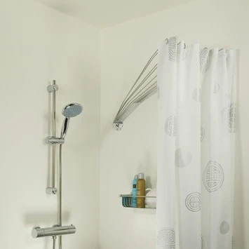 Sealskin Douchegordijnstang Umbrella Aluminium is een bijzonder ophangsysteem van Sealskin voor een douchegordijn waarbij geen gebruik gemaakt wordt van een douchestang maar van een speciale stalen constructie met 12 chroomen armen die boven de douche of het douchepaneel hangt. De houder van de armen is gemaakt van PP. De Umbrella heeft maar één bevestigingspunt nodig en is geschikt voor een douchegordijn met een breedte van 180 cm en 12 ophang oogjes.