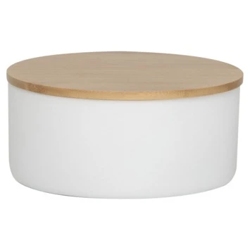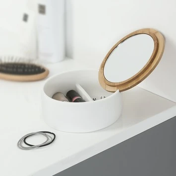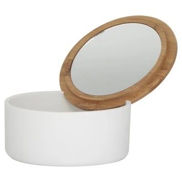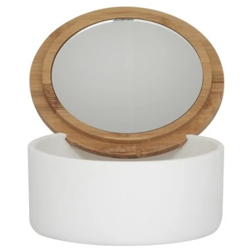 Het Sealskin Spiegeldoosje Grace Wit is gemaakt uit steen. Het doosje zelf is vervaardigd uit wit steen en het deksel heeft een bamboe accent. Het doosje is een sierraad voor je badkamer of make-up tafel. In het doosje kan je sierraden opbergen en in het houten deksel is een spiegeltje verborgen. Door het spiegeltje in de speciale inkepingen te plaatsen, kan het doosje ook gebruikt worden als make-up spiegel. Vervolledig deze Grace serie van Sealskin met de bijhorende zeepdispenser, toiletborstel met houder, beker en tandenborstelhouder.