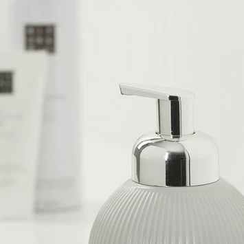 De Sealskin Zeepdispenser Convex Lichtgrijs is gemaakt uit keramiek. De afwerking van dit zeeppompje is een lichtgrijze pasteltint en heeft een reliëf in de vorm van verticale gebogen lijnen. Het pompje is handmatig te bedienen en de dispenser is navulbaar. Deze Scandinavische trend past in elke badkamer. Vervolledig deze Convex serie van Sealskin met de bijhorende beker en toiletborstel met houder. Je vindt deze sanitaire accessoires ook in andere pasteltinten, nl. lichtaqua en lichtroze.