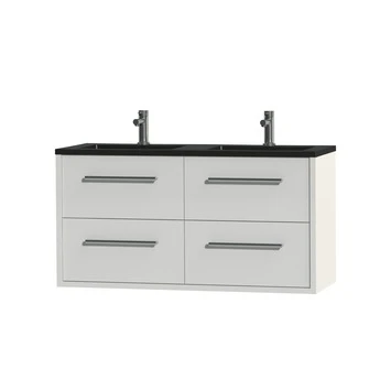 Het Tiger Boston badkamermeubel is krachtig en elegant tegelijk en de mooie ronde greep ligt aangenaam in de hand. De 4 lades bieden voldoende ruimte om alle badkamerartikelen overzichtelijk in op te bergen. Daarnaast zijn ze uitgerust met hoogwaardige ‘soft close’ geleiders waardoor ze geruisloos sluiten. De witte kleurgeeft het meubel een tijdloze uitstraling. De strakke, mat zwarte polybeton wastafel met imitatie natuursteen look maakt deze set compleet.