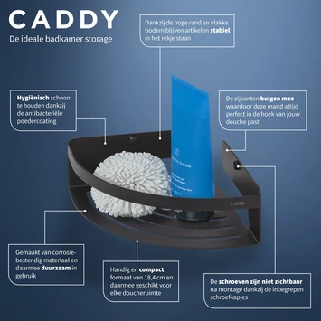 Deze Tiger hoekkorf Caddy zwart klein geeft je voldoende ruimte om je douchespullen op te zetten. Zo heb je alles binnen handbereik onder de douche of in bad. Het doucherek is 18 cm breed en 7 cm hoog. Deze hoekkorf is zo ontworpen dat je deze zelfs in moeilijke hoeken goed kunt monteren. De stang voorkomt dat je flessen van het rek vallen.