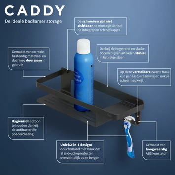 Tijdloos, uniek én multifunctioneel. Dat omschrijft het ontwerp van deze speelse douchemand mét haak van Tiger Caddy. Dit 2-in-1 design biedt naast je douchegel en shampoo ook ruimte voor je scheermes, handdoek of wisser. Zo kun je alles netjes opbergen en heb je altijd je spulletjes binnen handbereik. In de douche, bij de wastafel of in de toiletruimte. Met Caddy ga je niet alleen voor functioneel maar ook voor een elegante urban vibe in je badkamer.