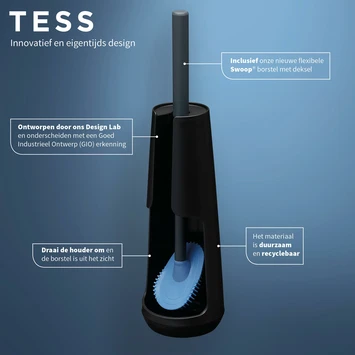 Een fris en modern gevoel in toilet of badkamer dankzij de zwarte wc-borstelhouder van Tiger Tess. Deze vrijstaande houder is voorzien van de nieuwe Swoop® flexibele toiletborstel. Met deze innovatieve borstelkop reinig je met gemak moeilijk bereikbare plekken en dankzij de vorm en het speciale materiaal van de borstel blijft er geen viezigheid achter en druppelt hij nauwelijks na als je hem terug in de houder plaatst. Draai de houder om en de borstel is niet langer meer in het zicht. Tiger Tess is innovatief en eigentijds met de herkenbare kwaliteit van Tiger.