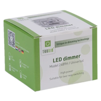 De Tradim 2489H is een hoog vermogen muurdimmer voor (filament) led, halogeen en gloeilampen. Geschikt voor 3-500W/VA, 3-250W led. Ideaal voor toepassing bij dimmen van veel lichtbronnen. Denk bijvoorbeeld aan kroonluchters of led panelen. Met deze dimmer is het mogelijk om de lampen te dimmen tot 5%. De lampen kunnen 100% worden uitgeschakeld door de druk / draai-schakelaar. Door de soft start van de dimmer heeft deze een gunstige invloed op de levensduur van de toegepaste led lampen. De minimale startwaarde kan worden ingesteld door middel van het stelschroefje. Wisselschakeling in combinatie met een gewone wisselschakelaar. Schakelt en stemt automatisch af op fase aan- of fase afsnijding. De dimmer past eenvoudig in een enkelvoudige, standaard inbouwdoos door de geringe inbouwdiepte (22 mm).