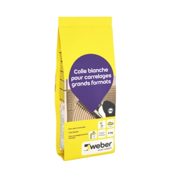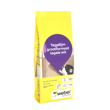 Weber tegellijm groot formaat wit 4kg is zeer geschikt voor het verlijmen van grootformaat keramische of natuurstenen tegels vanaf 40×40 cm. De poederlijm is voor binnen en buitengebruik en lijmt tegels op beton, zandcement, kalkzandsteen, gipsblokken, stucwerk, gipslaten en tegel op tegel. Ook geschikt om tegels te lijmen op hout, mits de ondergrond vormvast en stabiel is. De poedertegellijm is uitermate geschikt voor vloeren in combinatie met vloerverwarming. Weber tegellijm groot formaat wit 4kg is verpakt in een kunststof zak (PE) met een inhoud van 4 kilo en ook geschikt voor natuursteen tegels.