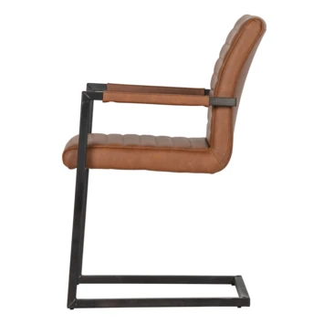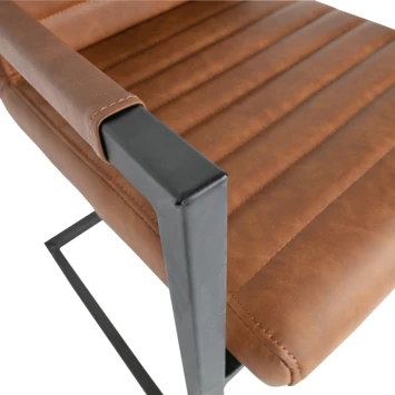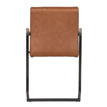 Bas is een moderne eetkamerstoel de zitting is bekleed met een vintage PU leren stof. De zitting heeft een ingestikte ribbel structuur. Het frame van de stoel is van metaal en afgewerkt met een cognac poedercoating.